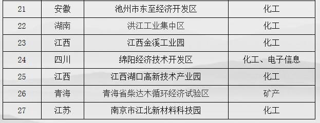 入圍的化工園區有:上?;瘜W工業區、四川什邡經濟開發區、安慶市高新技術產業開發區、姚家港化工園、宜都高新技術產業園、祥云財富工業園、連云港徐圩新區、江西德安工業園、泰興經濟開發區、荊門化工循環產業園、江西新干工業園、貴州福泉經濟開發區、池州市東至經濟開發區、洪江工業集中區、江西金溪工業園、綿陽經濟技術開發區、江西湖口高新技術產業園、南京市江北新材料科技園。