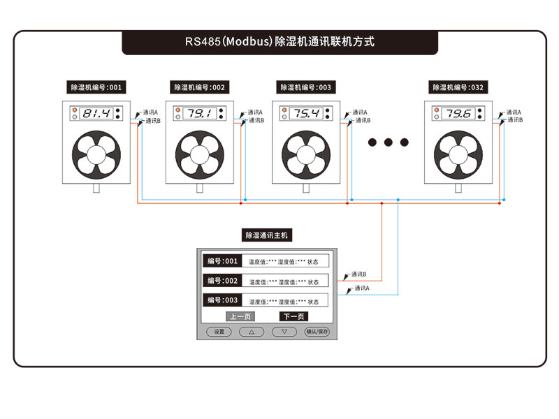 系統主要由:一臺主機和若干臺(1~32臺)抽濕器子機構成;抽濕器子機主要負責數據采集、環境控制和數據上傳;主機主要負責:數據分析、數據保存和相關參數設置。主機與抽濕器子機之間采用485通訊連接。